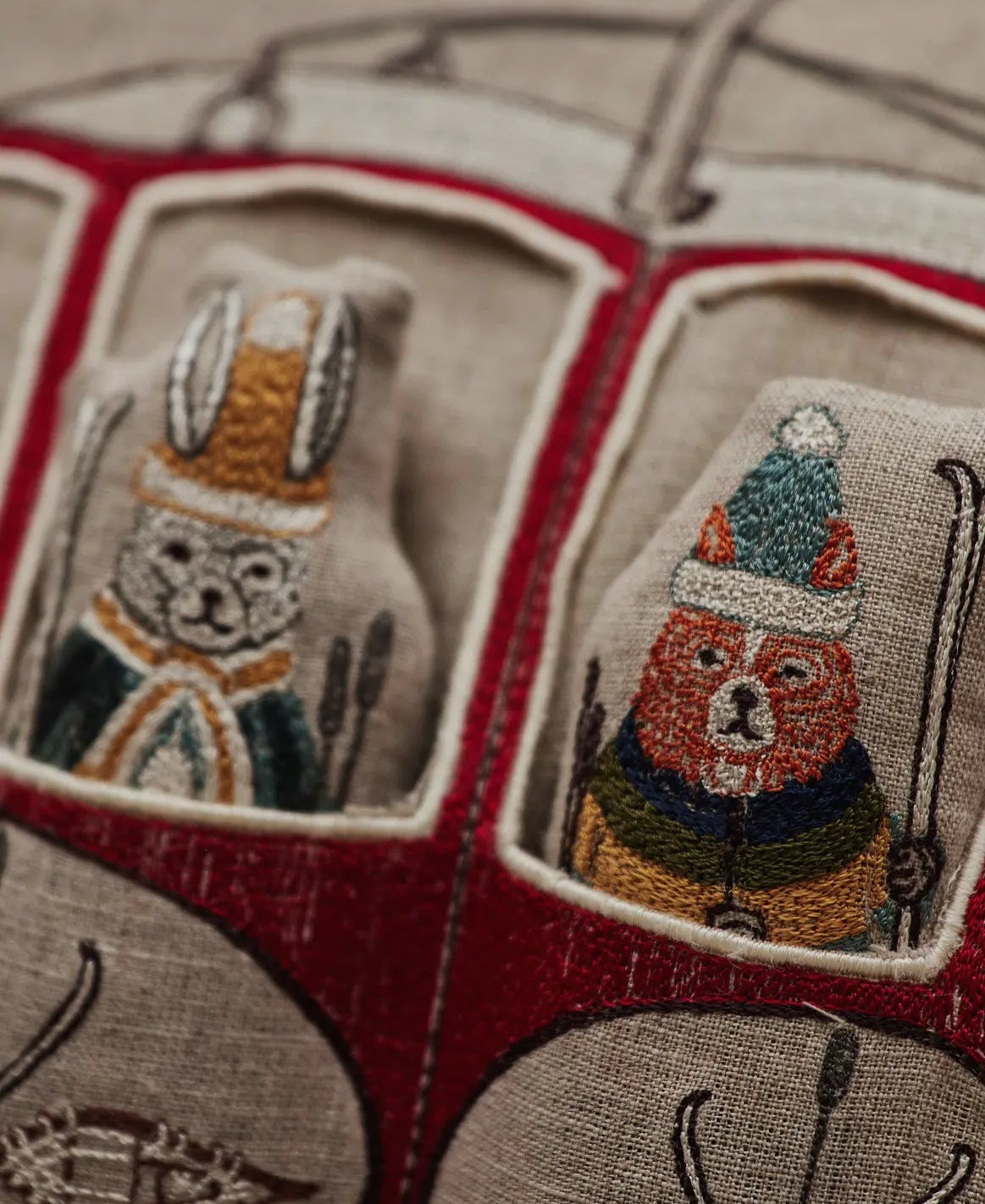 Embroidered on 100% linen fabric. Back fabric is 100% linen. Unbleached, undyed, and Oeko-Tex Standard 100 certified. Includes two removable poly-fil stuffed pals.